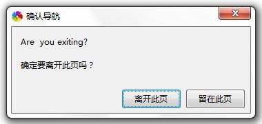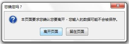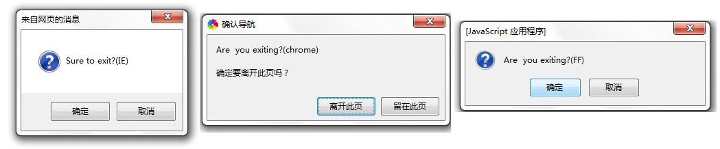 所以如果我们想要让它的确认框出现我们自己的东西,我尝试了许多次,发现FF无法做到用别的对话框代替它的默认框,所以我们只能默默的添加一个confirm,但是这样的话FF会有两次提示。IE和chrome都会在离开提示里输入函数的返回字符串,这一点还是不错的,以下是经过一楼的反馈后修改过的代码。