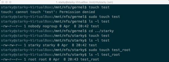 由于我在客户端和服务端都有一个名为 starky 的用户,且它们的 UID:GID 都为1000:1000,所以服务端的 /home/starky 目录可以直接被客户端的 starky 用户访问。且由于 no_root_squash 选项,通过 sudo 命令创建的文件其属主仍为 root(而不会再映射为 nobody)。