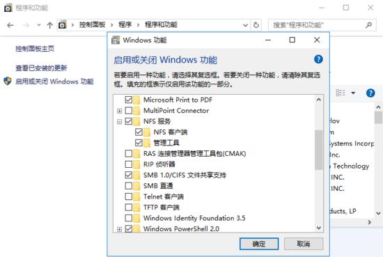 win10 系统默认不能挂载 NFS 共享目录,需要进入 控制面板 - 程序 - 程序和功能 - 启用或关闭 Windows 功能 ,勾选上 NFS 服务 。