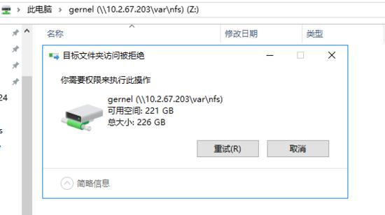 gernel 目录的属主(组)为 nobody:nogroup(65534:65534),所以虽然该目录为读写权限,非 root 用户无法执行新建操作。而 root 用户由于 NFS 默认的安全机制,会自动映射到 nobody:nogroup。