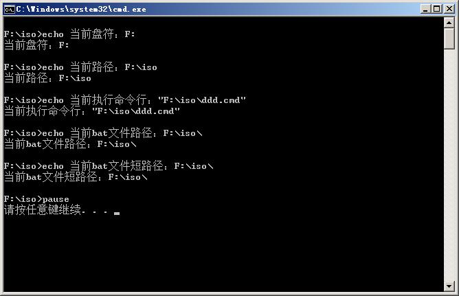 echo 当前盘符:%~d0 echo 当前路径:%cd% echo 当前执行命令行:%0 echo 当前bat文件路径:%~dp0 echo 当前bat文件短路径:%~sdp0