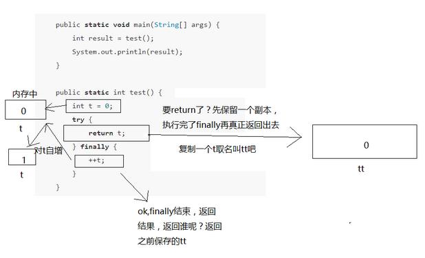 - 接下来执行finally语句块,finally中将t做了自增运算,t的确变成了1,但是这并没有影响t的复制体tt的值!保留起来的tt值还是0!