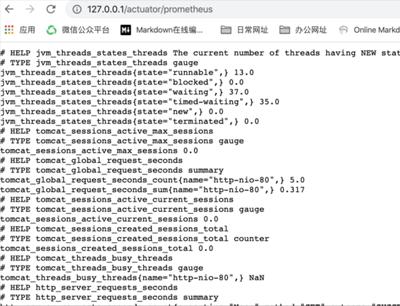 启动Springboot后,可以通过下面URL看能不能正确获取到监控数据:localhost/actuator/prometheus 获取数据成功,说明Springboot能正常提供监控数据。
