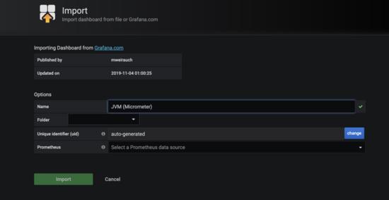 默认启动后Grafana地址为:http://localhost:3000/,登录用户名和密码是admin/admin,import配置grafana id = 4701