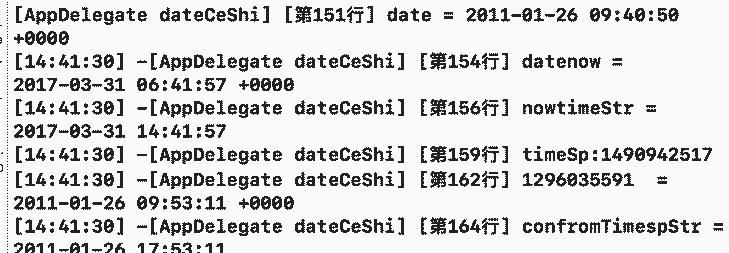 // 设置时间显示格式: NSString *timeStr = @"2011-01-26 17:40:50"; NSDateFormatter *formatter = [[NSDateFormatter alloc] init]; [formatter setDateStyle:NSDateFormatterMediumStyle]; [formatter setTimeStyle:NSDateFormatterShortStyle]; [formatter setDateFormat:@"YYYY-MM-dd HH:mm:ss"]; // ----------设置你想要的格式,hh与HH的区别:分别表示12小时制,24小时制 //设置时区,这个对于时间的处理有时很重要 //例如你在国内发布信息,用户在国外的另一个时区,你想让用户看到正确的发布时间就得注意时区设置,时间的换算. //例如你发布的时间为2010-01-26 17:40:50,那么在英国爱尔兰那边用户看到的时间应该是多少呢? //他们与我们有7个小时的时差,所以他们那还没到这个时间呢...那就是把未来的事做了 NSTimeZone* timeZone = [NSTimeZone timeZoneWithName:@"Asia/Shanghai"]; [formatter setTimeZone:timeZone]; NSDate *date = [formatter dateFromString:timeStr]; //------------将字符串按formatter转成nsdate NSLog(@"date = %@", date); NSDate *datenow = [NSDate date];//现在时间,你可以输出来看下是什么格式 NSLog(@"datenow = %@", datenow); NSString *nowtimeStr = [formatter stringFromDate:datenow];//----------将nsdate按formatter格式转成nsstring,nsstring会显示与当前的时间吻合的串 NSLog(@"nowtimeStr = %@", nowtimeStr); // 时间转时间戳的方法: NSString *timeSp = [NSString stringWithFormat:@"%ld", (long)[datenow timeIntervalSince1970]]; NSLog(@"timeSp:%@",timeSp); //时间戳的值 // 时间戳转时间的方法 NSDate *confromTimesp = [NSDate dateWithTimeIntervalSince1970:1296035591]; NSLog(@"1296035591 = %@",confromTimesp); NSString *confromTimespStr = [formatter stringFromDate:confromTimesp]; NSLog(@"confromTimespStr = %@",confromTimespStr); // 时间戳转时间的方法: NSDateFormatter* formatter1 = [[NSDateFormatter alloc] init]; [formatter1 setDateStyle:NSDateFormatterMediumStyle]; [formatter1 setTimeStyle:NSDateFormatterShortStyle]; [formatter1 setDateFormat:@"yyyyMMddHHMMss"]; NSDate *date1 = [formatter1 dateFromString:@"1283376197"]; NSLog(@"date1:%@",date1); 当前时间是:14:41:57