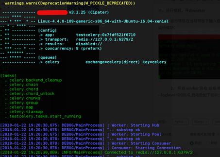 2,开启worker另在当前项目下另打开一个终端,输入指令: celery -A TestCelery worker --loglevel=DEBUG,启动后如下如示: