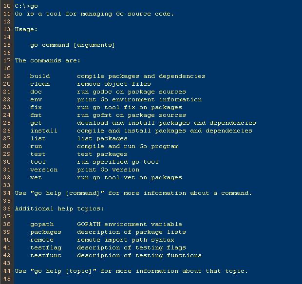Go语言自带有一套完整的命令操作工具,你可以通过在命令行中执行go来查看它们: