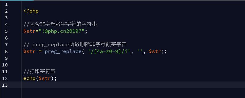 <?php //包含非字母数字字符的字符串 $str="!@php.cn2019?"; // preg_replace函数删除 //非字母数字字符 $str = preg_replace( '/[^a-z0-9]/i', '', $str); //打印字符串 echo($str); ?>