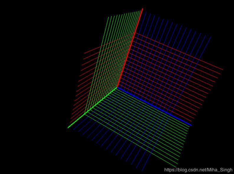 绘制三维的坐标系,并绘制由坐标轴构成的平面的网格,各个坐标轴的颜色以及由坐标轴所引出的网格线的颜色为: