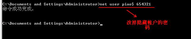 得知隐藏账户的名称后就好办了,但是我们仍然不能删除这个隐藏账户,因为我们没有权限。但是我们可以在“命令提示符”中输入“net user 隐藏账户名称 654321”更改这个隐藏账户的密码。这样这个隐藏账户就会失效,黑客无法再用这个隐藏账户登陆。