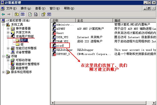 我们来看看隐藏账户的建立是否成功。在“命令提示符”中输入查看系统账户的命令“net user”,回车后会显示当前系统中存在的账户。从返回的结果中我们可以看到刚才我们建立的“piao$”这个账户并不存在。接着让我们进入控制面板的“管理工具”,打开其中的“计算机”,查看其中的“本地用户和组”,在“用户”一项中,我们建立的隐藏账户“piao$”暴露无疑。