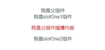 <template> <div> 我是父组件 <slotOne1> <p style="color:red">我是父组件插槽内容</p> <slot-one2></slot-one2> </slotOne1> </div> </template>