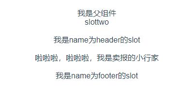 <template> <div> 我是父组件 <slot-two> <p>啦啦啦,啦啦啦,我是卖报的小行家</p> <template slot="header"> <p>我是name为header的slot</p> </template> <p slot="footer">我是name为footer的slot</p> </slot-two> </div> </template>