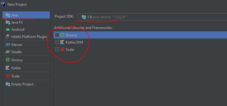 选择 Create Project 创建Java/Scala程序,这一步关键是要选择你的JDK。如果你下载或安装了多个版本的JDK且被IDEA识别,那么你可以用下拉列表选择合适的JDK的版本。