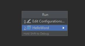 然后我们就可以通过Run命令运行这个HelloWord 程序了,运行的时候直接选择默认配置: