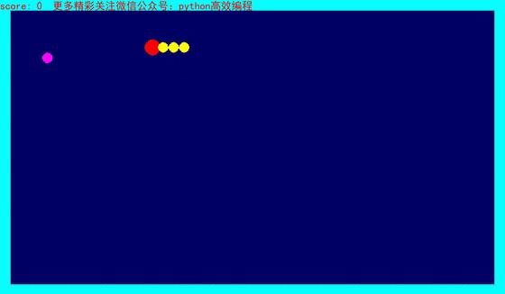 首先__init__初始化贪吃蛇的位置,初始方向竖直向上。toward函数用于改变贪吃蛇的方向,(x,y)分别表示蛇头在水平和竖直方向的朝向。朝左x=-1,朝右x=1,朝上y=-1,朝下y=1。move函数,使用标志enlarge来判断蛇是否吃到了食物,并进行相应的操作。eat_food函数判断蛇是否吃到食物,吃到的话,分数加 100,并返回True。toward函数,用于改变蛇头的方向,但如果改变方向与当前方向相反,就什么操作都不执行。draw函数用于画出贪吃蛇的模样,蛇头是略大一点的红心,蛇身是小一点的黄心。