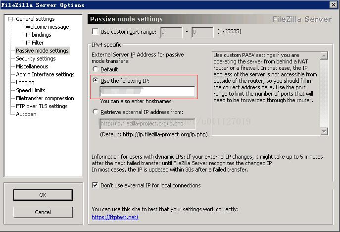 选择“Passive mode settings”选项卡输入端口范围,勾选“Use the following IP:”并填写服务器的IP地址(注外网地址),之后点击“OK”保存;