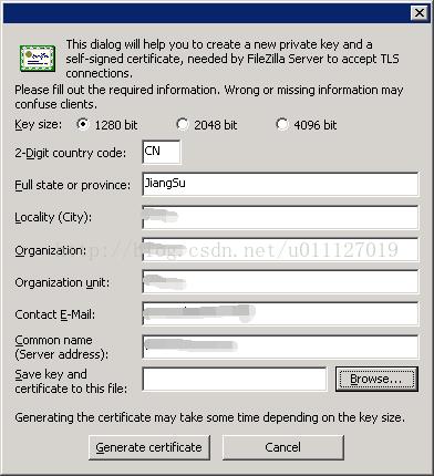 生成验证时Key size”根据自己的喜好选择即可,其他信息可以根据自己的情况随意填写,然后选择保存地址(最好放到安装路径下) “;
