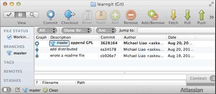 $ git log commit 3628164fb26d48395383f8f31179f24e0882e1e0 Author: Michael Liao <askxuefeng@gmail.com> Date: Tue Aug 20 15:11:49 2013 +0800 append GPL commit ea34578d5496d7dd233c827ed32a8cd576c5ee85 Author: Michael Liao <askxuefeng@gmail.com> Date: Tue Aug 20 14:53:12 2013 +0800 add distributed commit cb926e7ea50ad11b8f9e909c05226233bf755030 Author: Michael Liao <askxuefeng@gmail.com> Date: Mon Aug 19 17:51:55 2013 +0800 wrote a readme file