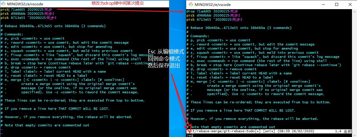 $ git rebase -i HEAD~2 pick 71add05 20200225同步 pick 45d4805 测试删除中间某次commit # Rebase 36b460a..45d4805 onto 36b460a (2 commands) # # Commands: # p, pick <commit> = use commit # r, reword <commit> = use commit, but edit the commit message # e, edit <commit> = use commit, but stop for amending # s, squash <commit> = use commit, but meld into previous commit # f, fixup <commit> = like "squash", but discard this commit's log message # x, exec <command> = run command (the rest of the line) using shell # b, break = stop here (continue rebase later with 'git rebase --continue') # d, drop <commit> = remove commit # l, label <label> = label current HEAD with a name # t, reset <label> = reset HEAD to a label # m, merge [-C <commit> | -c <commit>] <label> [# <oneline>] # . create a merge commit using the original merge commit's # . message (or the oneline, if no original merge commit was # . specified). Use -c <commit> to reword the commit message. # # These lines can be re-ordered; they are executed from top to bottom. # # If you remove a line here THAT COMMIT WILL BE LOST. # # However, if you remove everything, the rebase will be aborted. # # Note that empty commits are commented out