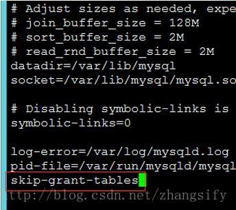 1、由于一开始并不知道密码,先修改配置文件/etc/my.cnf,让mysql跳过登录时的权限验证。加入一行: