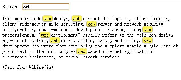 这是一款基于jquery实现的高亮显示网页上搜索关键词的代码,当你在文本框中输入的时候,如果下面的正文中包括你输入的内容,也就是关键字,那么这些关键字是会高亮显示的,被动态添加成黄色,看上去很醒目,就像百度快照显示关键词的样子。