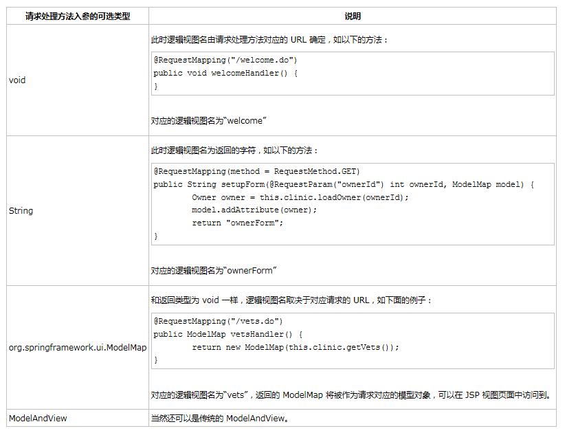 应该说使用 String 作为请求处理方法的返回值类型是比较通用的方法,这样返回的逻辑视图名不会和请求 URL 绑定,具有很大的灵活性,而模型数据又可以通过 ModelMap 控制。当然直接使用传统的 ModelAndView 也不失为一个好的选择。