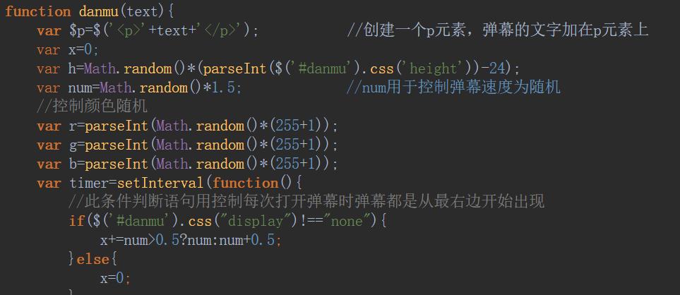 4、首先在HTML里定义一个现实弹幕的容器,id为danmu。在js文件中,定义一个弹幕方法,具体代码如下