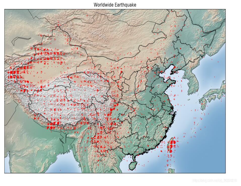 本项目是利用五年左右的世界地震数据,通过python的pandas库、matplotlib库、basemap库等进行数据可视化,绘制出地震散点图。主要代码如下所示
