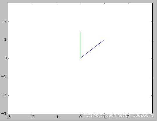 import numpy as np import math import matplotlib.pyplot as plt # 绕pointx,pointy逆时针旋转 def Nrotate(angle,valuex,valuey,pointx,pointy): valuex = np.array(valuex) valuey = np.array(valuey) nRotatex = (valuex-pointx)*math.cos(angle) - (valuey-pointy)*math.sin(angle) + pointx nRotatey = (valuex-pointx)*math.sin(angle) + (valuey-pointy)*math.cos(angle) + pointy return nRotatex, nRotatey # 绕pointx,pointy顺时针旋转 def Srotate(angle,valuex,valuey,pointx,pointy): valuex = np.array(valuex) valuey = np.array(valuey) sRotatex = (valuex-pointx)*math.cos(angle) + (valuey-pointy)*math.sin(angle) + pointx sRotatey = (valuey-pointy)*math.cos(angle) - (valuex-pointx)*math.sin(angle) + pointy return sRotatex,sRotatey pointx = 1 pointy = 1 sPointx ,sPointy = Nrotate(math.radians(45),pointx,pointy,0,0) print(sPointx,sPointy) plt.plot([0,pointx],[0,pointy]) plt.plot([0,sPointx],[0,sPointy]) plt.xlim(-3.,3.) plt.ylim(-3.,3.) plt.xticks(np.arange(-3.,3.,1)) plt.yticks(np.arange(-3.,3.,1)) plt.show()