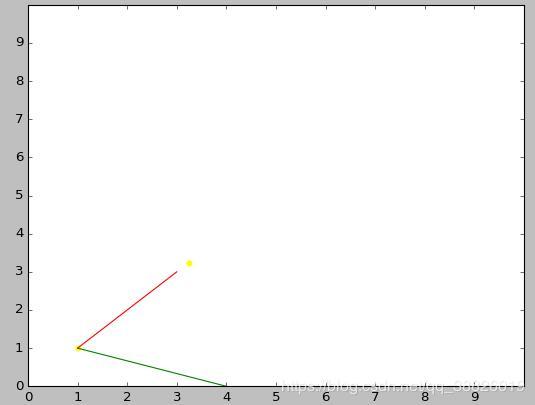 import numpy as np import math import matplotlib.pyplot as plt # 绕pointx,pointy逆时针旋转 def Nrotate(angle,valuex,valuey,pointx,pointy): valuex = np.array(valuex) valuey = np.array(valuey) nRotatex = (valuex-pointx)*math.cos(angle) - (valuey-pointy)*math.sin(angle) + pointx nRotatey = (valuex-pointx)*math.sin(angle) + (valuey-pointy)*math.cos(angle) + pointy return nRotatex, nRotatey # 绕pointx,pointy顺时针旋转 def Srotate(angle,valuex,valuey,pointx,pointy): valuex = np.array(valuex) valuey = np.array(valuey) sRotatex = (valuex-pointx)*math.cos(angle) + (valuey-pointy)*math.sin(angle) + pointx sRotatey = (valuey-pointy)*math.cos(angle) - (valuex-pointx)*math.sin(angle) + pointy return sRotatex,sRotatey x1 = np.array([1,2,3]) y1 = np.array([1,2,3]) x2 = np.array([3,6]) y2 = np.array([2,1]) # x2往x1上拼 disx = x2[0]-x1[0] disy = y2[0]-y1[0] removeX2 = x2-disx removeY2 = y2-disy tany1 = y1[-1]-y1[0] tanx1 = x1[-1]-x1[0] angle1 = math.degrees(np.arctan(tany1/tanx1)) tany2 = y2[-1]-y2[0] tanx2 = x2[-1]-x2[0] angle2 = math.degrees(np.arctan(tany2/tanx2)) disAngle = angle2-angle1 print(angle1) print(angle2) print(disAngle) if disAngle<0: rotateX,rotateY = Nrotate(math.radians(abs(disAngle)),removeX2,removeY2,x1[0],y1[0]) else: rotateX,rotateY = Srotate(math.radians(abs(disAngle)),removeX2,removeY2,x1[0],y1[0]) plt.plot(x1,y1,color='red') plt.plot(removeX2,removeY2,color='green') plt.scatter(rotateX,rotateY,color='yellow') plt.xlim(0.,10.) plt.ylim(0.,10.) plt.xticks(np.arange(0.,10.,1)) plt.yticks(np.arange(0.,10.,1)) plt.show()