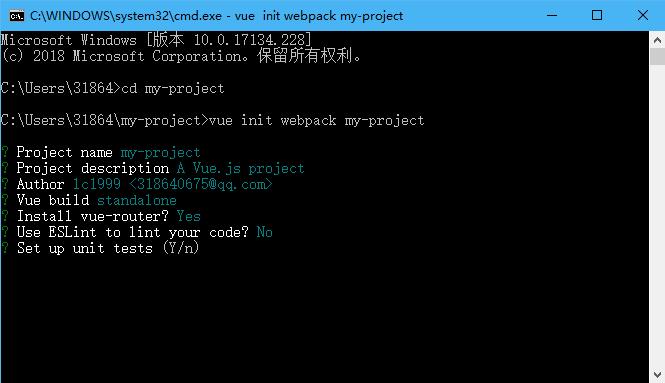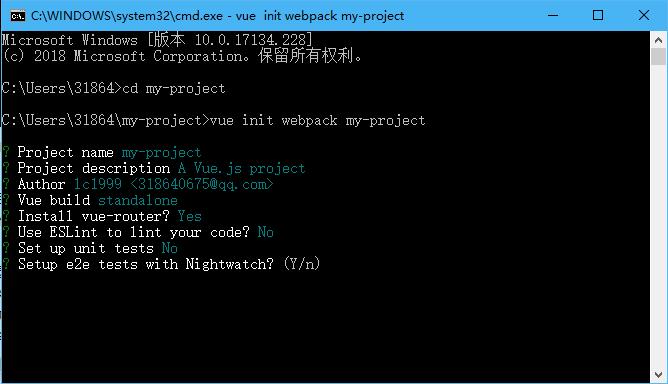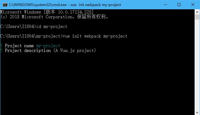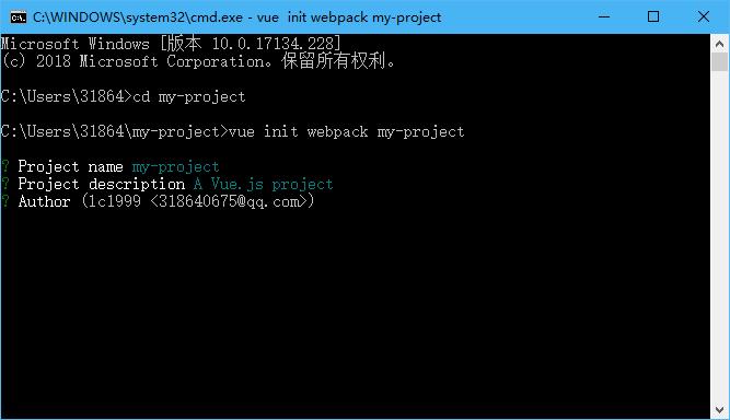 4、运行vueinitwebpack demo(注:项目名称)回车,(想在哪个目录建立vue项目就要在进入到对应目录再输入命令)