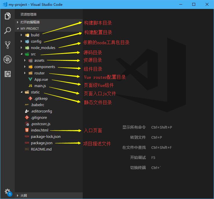 到此为止你已经学会了怎么安装 vue-cli脚手架工具了,下面我简单的说明下各个目录都是干嘛的: