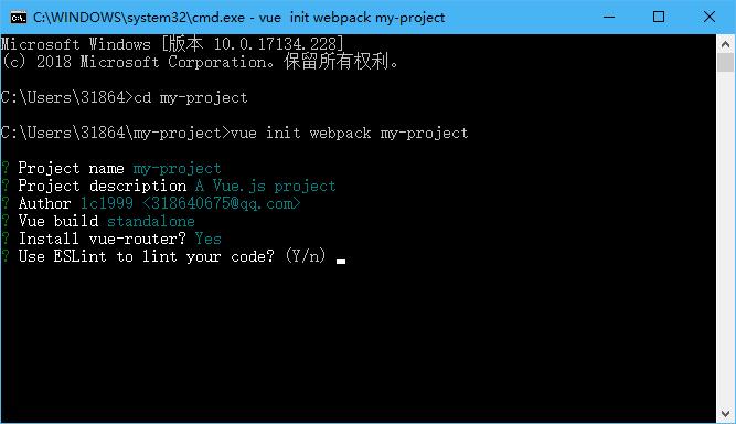 9、User ESLint to lint your code? 选Y(是否启用eslint检测规则,如果不是公司的大型项目或者多人共同开发博主感觉没有必要安装)