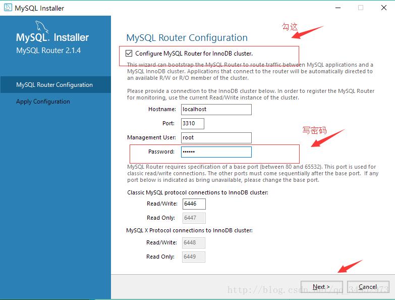 但是我的这里下一步中有一个creating mysql router configuration files失败了我就点击cancel(因为百度出来的答案说是权限问题我不懂怎么改),然后直接来到connect server,直接在下面输入密码然后check后next,会又有一个让我们execute的界面,点击然后就可以finish了(忘记截图了,抱歉)