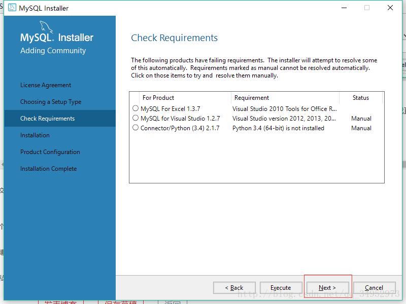 接下来下面选框里面的意思是说装的过程中需要这些依赖但是这些依赖没有装,因为我不玩python,所以我直接点击的next,如果大家有人需要用python之类的话可以点击execute,后续步骤我就没有放出来了。next后会有一个confirm框,点击yes即可