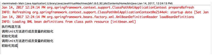 <?xml version="1.0" encoding="UTF-8"?> <beans xmlns="http://www.springframework.org/schema/beans" xmlns:xsi="http://www.w3.org/2001/XMLSchema-instance" xmlns:p="http://www.springframework.org/schema/p" xmlns:aop="http://www.springframework.org/schema/aop" xsi:schemaLocation="http://www.springframework.org/schema/beans http://www.springframework.org/schema/beans/spring-beans.xsd"> <bean id="init" class="com.model.InitBean" init-method="init"/> </beans>