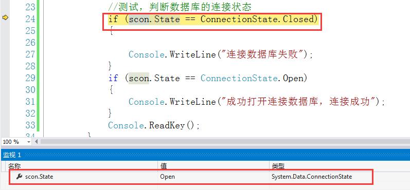Console.WriteLine("成功打开连接数据库,连接成功");