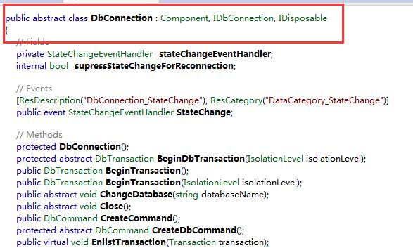 从图中可以看出,Dbconnection类是一个抽象类,继承了Component类,实现了IDbConnection接口,和IDisposable接口,下面我们分别来看看这几个