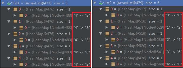 方案一,我们只是把map.clear了(查看clear的源码,clear的作用是把map里每个属性设置为null,并把map的长度设置为0)。并没有销毁,map的指针还是存储在list里面了,所以后面新add到list里面的东西都是同一个map,都是指向同一个map,list里面存储的是map的指针;