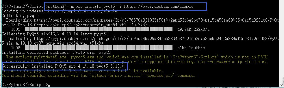 命令:python37 -m pip install PyQt5 -i https://pypi.douban.com/simple
