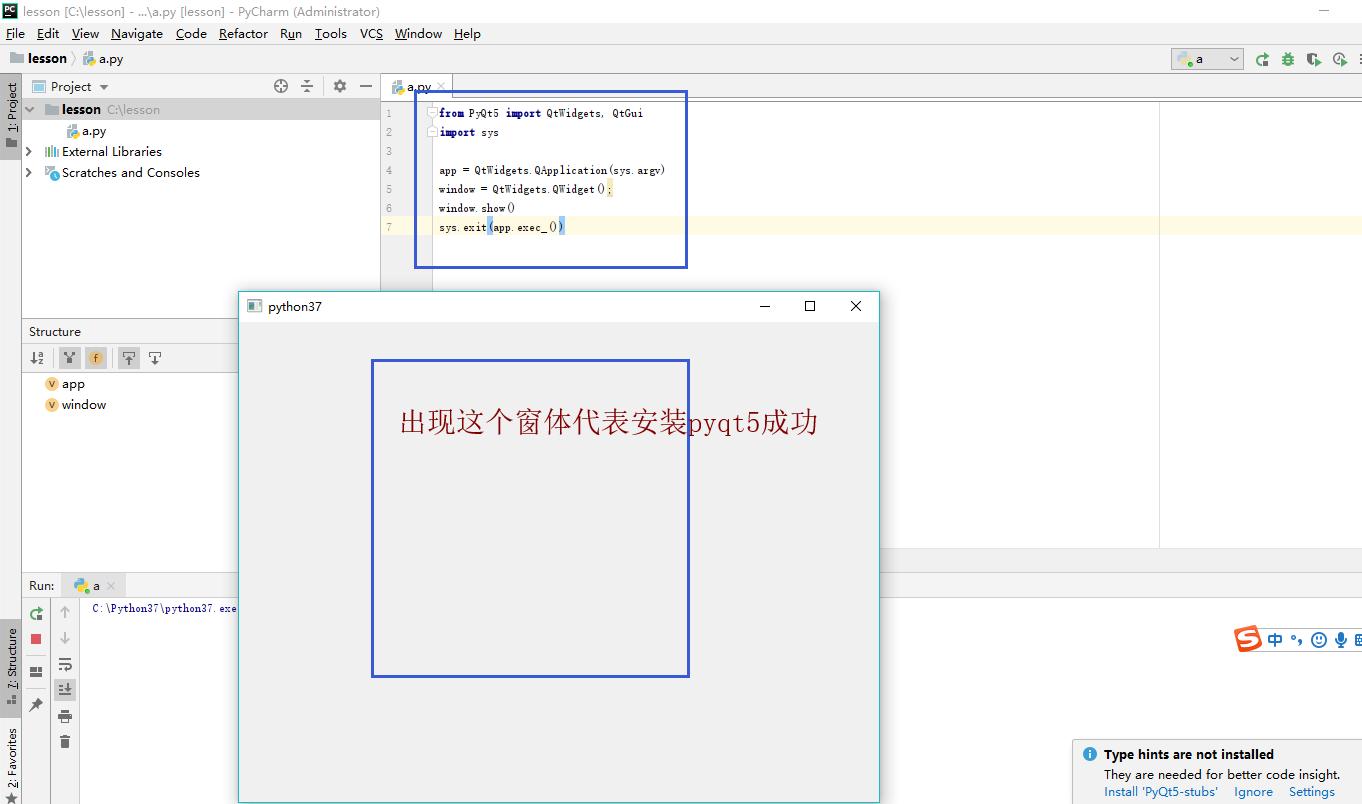 第六步:验证Qt5 是否安装成功,在pycharm中编写如下代码: