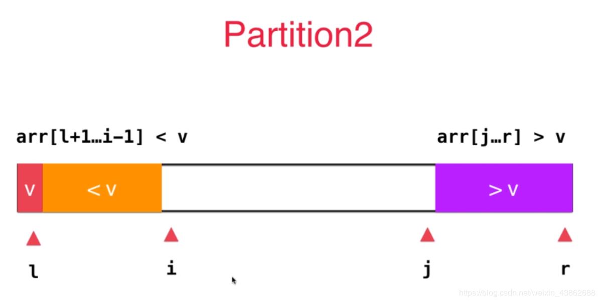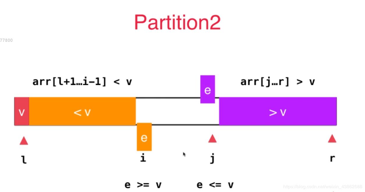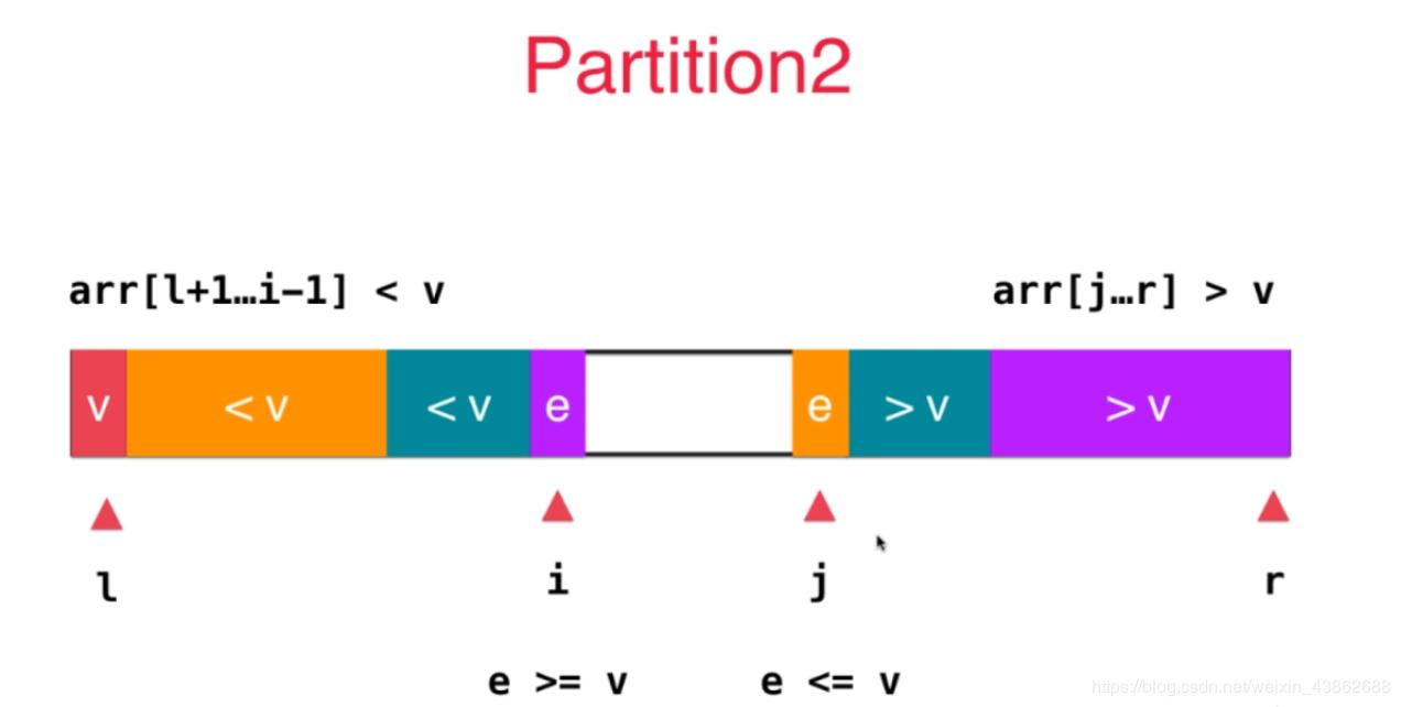 为了解决这个问题,双路快速排序采用的方法是对等于v的数也进行交换,原理如下所述: