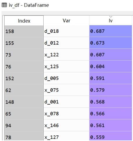 iv_df = pd.DataFrame({'Var': names, 'Iv': ivlist}, columns=['Var', 'Iv'])