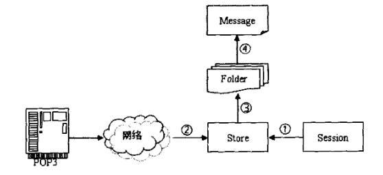 上一篇JavaMail入门第三篇 发送邮件中,我们学会了如何用JavaMail API提供的Transport类发送邮件,同样,JavaMail API中也提供了一些专门的类来对邮件的接收进行相关的操作,在介绍这些类之前,我们先来了解下邮件接收API的体系结构,JavaMail API中定义了一个java.mail.Store类,它用于执行邮件的接收任务,我们在程序中调用这个类中的方法可以获取邮箱中的各个邮件夹的信息。JavaMail使用Folder对象表示邮件夹,通过Folder对象的方法可以获取邮件夹中的所有邮件信息,而我们知道邮件的信息可以使用Message对象来表示,Message类中就包含了操作邮件的各种方法了,例如获取邮件的发送者,主题,正文内容,发送时间等,它们工作关系如下: