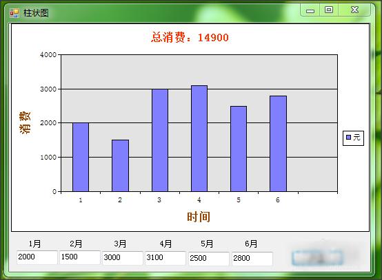 10、在6个月的消费金额中分别输入2000, 1500,3000, 3100,2500, 2800,点击【产生】,可以看到生成的柱状图。