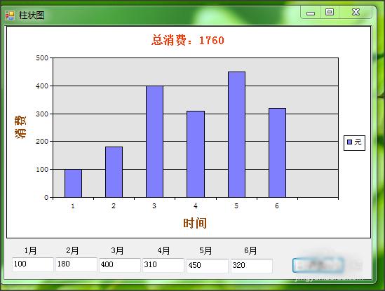11、在6个月的消费金额中分别输入100, 180,400, 310,450, 320,点击【产生】,可以看到生成的柱状图。