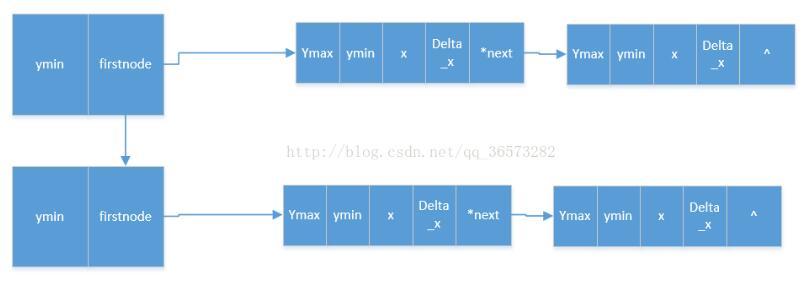 为了节省存储的空间,边表项也使用链表结构,将图形中ymin值相同的边链接在同一个边表项后,这样在扫描的时候方便添加。