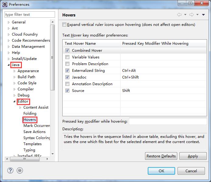 解决方法:在Eclipse中点击 Window->Preferences->Java->Editor->Hovers, 勾选Variable Values,(如果Combined Hover已经选择了,就取消它), 然后点击Apply,最后点OK。